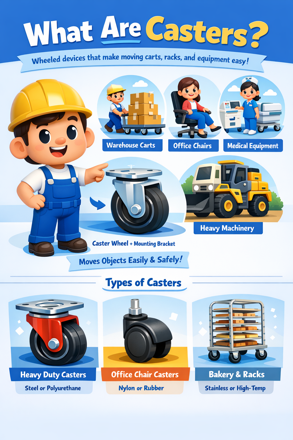 You'll see casters everywhere on warehouse carts, medical equipment, bakery racks, office chairs, and heavy industrial machinery. While they may look simple, casters are carefully designed components that play a major role in how equipment performs.