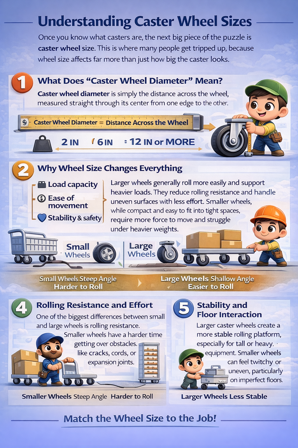 The key is choosing a wheel size that matches the load, floor conditions, and available space, not just the smallest or least expensive option.