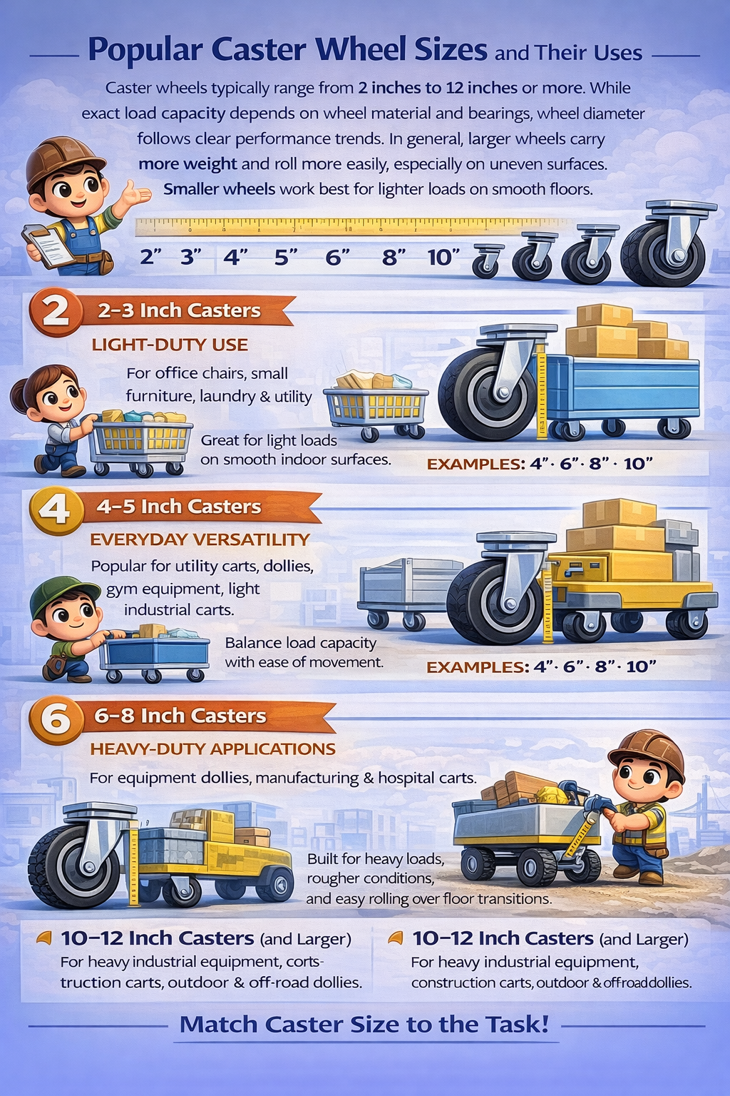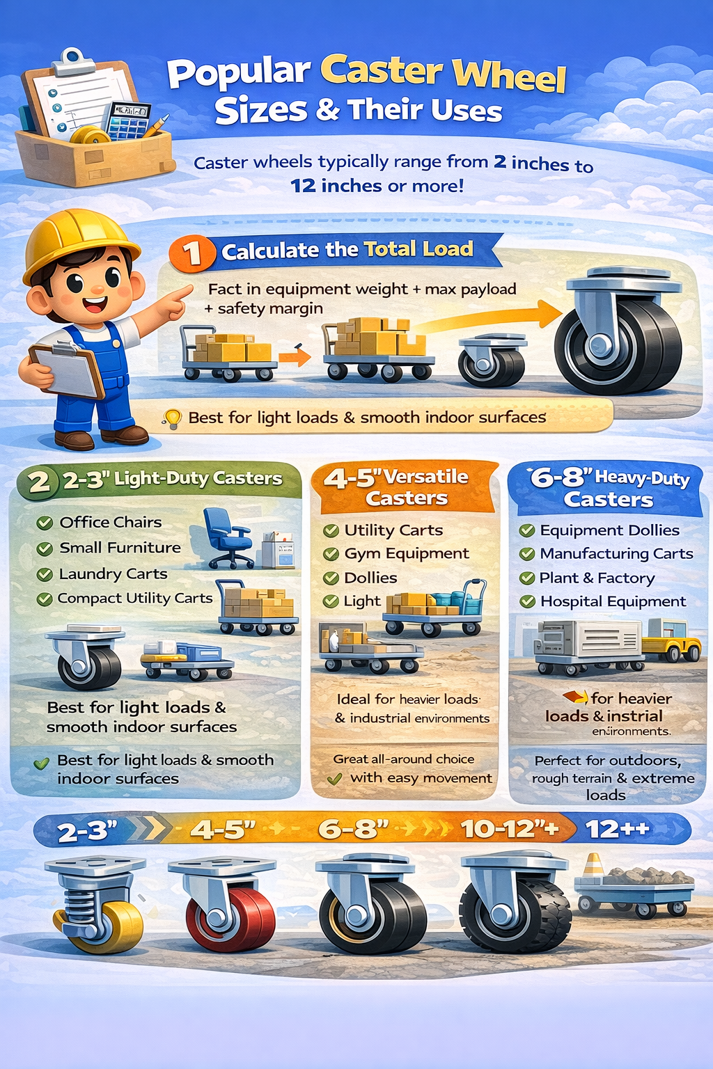 Caster wheels typically range from 2 inches to 12 inches or more. While exact load capacity depends on wheel material and bearings, wheel diameter follows clear performance trends.